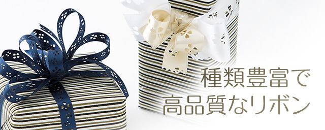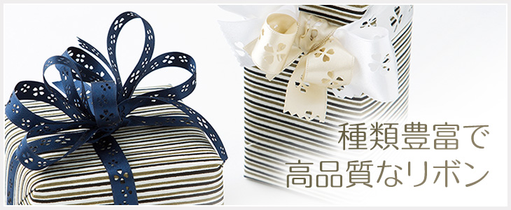 リボンにあなたのお店名やロゴを名入れ印刷。1巻30mからの小ロット低価格で制作。店舗用・イベント用に。種類豊富な無地リボンも販売。